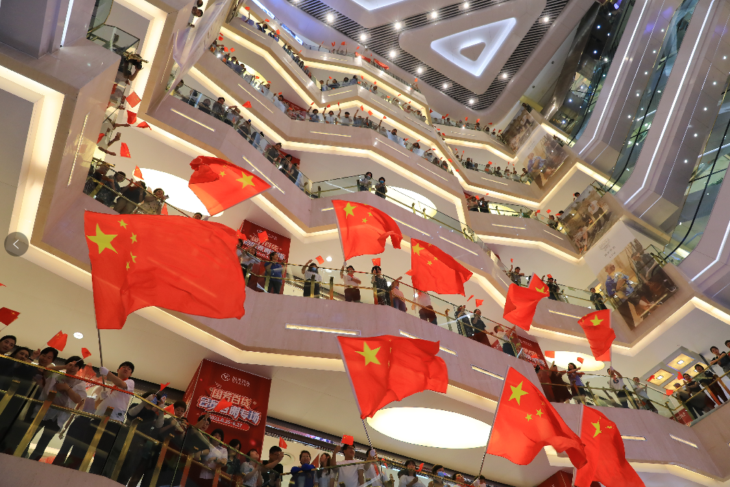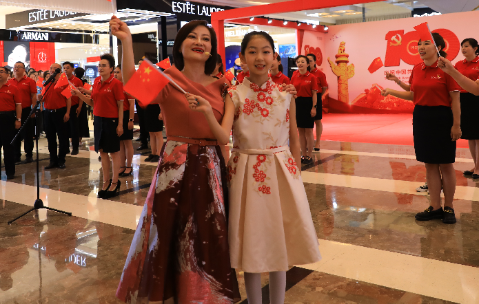 國芳百貨中廳,隨著鋼琴聲響起,活動在男、女領唱“歌唱我們親愛的祖國,從此走上繁榮富強”的歌聲中拉開了活動的序幕,30余名國芳集團黨員及員工代表緩緩向主舞臺走來,大家手持國旗,組合成“100”字樣,神采奕奕,高聲齊唱。與此同時,現場的圍觀顧客也紛紛加入到隊伍當中,為演出錦上添花。